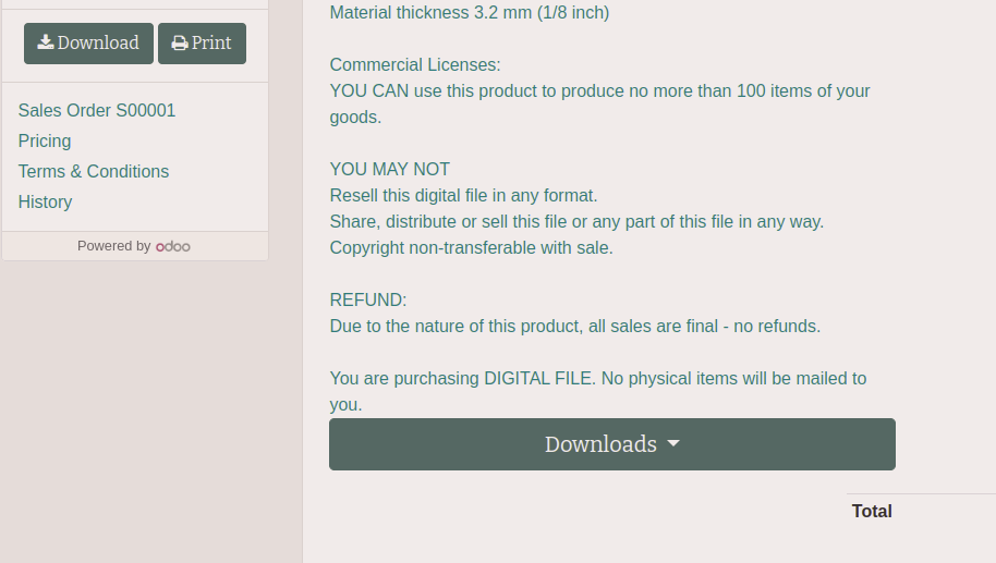 After payment proceed please go to your sale order and scroll down. Please press DOWNLOADS button at the bottom of the screen.